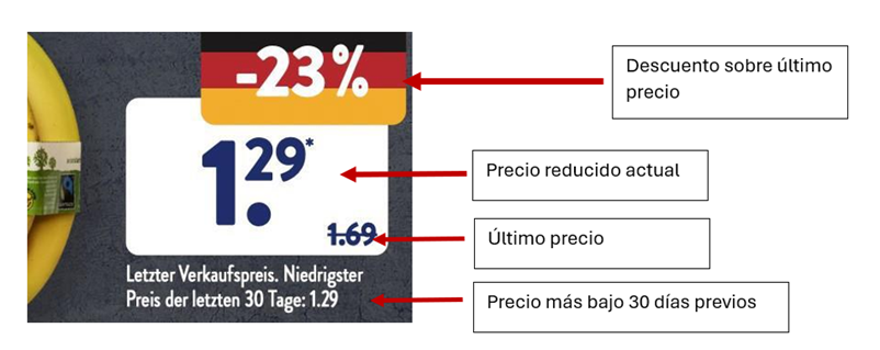 La pregunta planteada recientemente al Tribunal Europeo gira en torno al modo de indicar el descuento porcentual del precio reducido. En el caso juzgado, la cadena de supermercados Aldi ponía en su oferta, dos precios anteriores, por un lado, el último precio antes del descuento y por otro el precio más bajo del mismo producto en los 30 días previos, pero el porcentaje de descuento indicado era sobre el último precio del artículo.